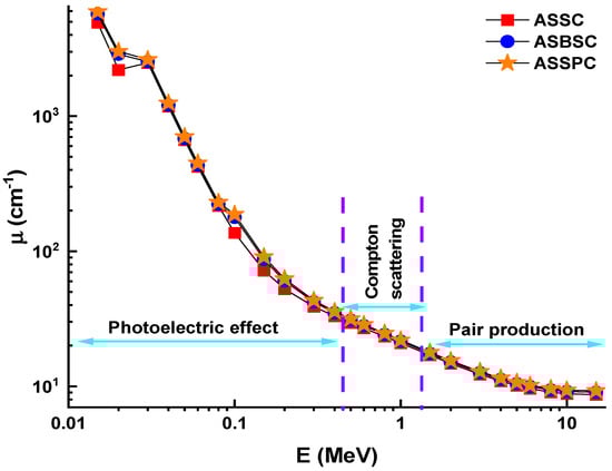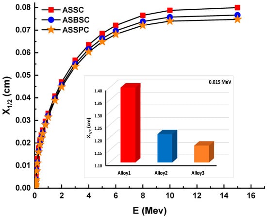 As a first step, linear attenuation coefficients (LAC) of alloy samples were determined in 0.015–15 MeV photon energy range. The term LAC (µ) is known as an important shielding parameter for any type of candidate material that might be utilized in radiation facilities. This density-dependent parameter is a useful term to evaluate the performance of shielding material on attenuation of primary gamma rays. Figure 1 shows the variation of LAC values of ASSC, ASBSC, and ASSPC samples against photon energy. As clearly seen from Figure 1, variation of LAC values was directly affected by three basic interaction types, namely, photoelectric effect, Compton scattering, and pair production in different energy zones [40,41,42,43]. This situation is the nature of radiation interaction with matter depending on energy. In the low-energy region, LAC values are dramatically decreased due to the dominancy of the photoelectric effect. In the mid-energy region, Compton scattering was the dominant process that affected LAC values’ variation trend from sharp to smooth. However, the highest LAC values were reported for the ASSPC sample, which has the highest Pb concentration in its composition. To make it more straightforward, LAC values are listed as 8.668, 9.044, and 9.275 (cm−1) for ASSC, ASBSC, and ASSPC samples at 15 MeV photon energy, respectively. Mass attenuation coefficients (MAC) are defined as the density-independent material coefficient. MAC can be obtained for specific photon energy via dividing LAC values by sample density. The same trend is also evident for the variation of MAC versus photon energy (E) for studied alloy samples. The energy (gamma photon incident) and alloy structure (chemical composition) have modified the variation of MAC values. The gap of the MAC with energy is characteristic in three different zones. In the low energy area where the photoelectric effect is a dominant mechanism in the interaction, the MAC values decrease quickly as gamma energies rise. This decrease was slower at higher energies. The dominance of Compton scattering also showed a smooth decrease in the second region [44,45]. However, a decrease against increasing gamma-ray energy was also reported for MAC values similar to LAC. The highest MAC values for the ASSPC sample were recorded at all incident photon energies. For example, MAC values were recorded as 25,246, 25,703, and 25,827 (cm2/g) for ASSC, ASBSC, and ASSPC samples at 15 MeV photon energy, respectively. The effect of high atomic number can explain this in the material composition in that ASSPC sample has the maximum Pb additive in its structure. The gamma shielding capability of shielding materials should also be tested in terms of the half-value layer (HVL) transmission factor.