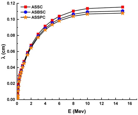The term HVL (also known as X1/2) is significant in radiation shielding research since it allows for the quantification of the material thickness required to halve the initial gamma-ray intensity. This is because radiation studies necessitate that shielding needs be determined in advance depending on the kind and energy of the radiation used. Therefore, the quantity of the HVL required for each kind of prospective shielding material should be determined in terms of a more complete understanding of the gamma ray attenuation capabilities during the incoming gamma ray’s contact with the attenuator specimen. Variation of HVL (cm) values of investigated glasses as a function of incident photon energy (MeV) is shown in Figure 2. As indicated in the Materials and Methods section, the linear attenuation coefficients and HVL quantities have an inverse relationship. As a result, it is reasonable to anticipate that the minimum HVL values would be found in the sample with the maximum linear attenuation coefficient values. Fortunately, our results indicated that the ASSPC sample with the highest alloy density and linear attenuation coefficients has the minimum HVL values. For example, HVLs were reported to be 0.033, 0.032, and 0.031 cm for ASSC, ASBSC, and ASSPC samples at 1 MeV photon energy, respectively. The term mean free path (MFP, λ) is the route taken by a photon through a substance without colliding. Therefore, it can be said that a lower distance in MFP values is a clear indicator for superior attenuation properties. Figure 3 depicts the variation of MFP (cm) values of investigated glasses as a function of incident photon energy (MeV). As mentioned above for previous attenuation properties, the ASSPC sample with the highest alloy density was also reported with its minimum MFP values. For instance, MFP values (cm) were reported as 0.048, 0.046, and 0.045 for ASSC, ASBSC, and ASSPC samples at 1 MeV photon energy, respectively.