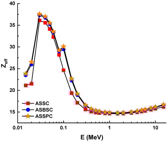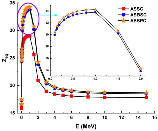 Figure 4 illustrates the variation of the effective atomic number (Zeff) values of investigated alloys as a function of incident photon energy (MeV). From Figure 4, one can observe that the sample ASSPC has the maximum values of Zeff, while ASSC sample has the minimum values of Zeff. This is because with the increasing amount of Bi and Pb ions (Z = 83 and 82) and decreasing amount of Al ions (Z = 13), Zeff will be increased. We found that the maximum Zeff for the ASSPC sample was registered at 30 keV with a value of 37.58. Furthermore, the Zeff discontinuity at 0.1 MeV could be attributable to Bi and Pb k-absorption edges. On the other hand, equivalent atomic numbers (Zeq) for the three types of alloys were determined to calculate exposure buildup factor (EBF) and energy absorption buildup factor (EABF) using the geometry progressive (G-P) fitting method. The variation of Zeq is shown in Figure 5. As can be seen from the figure, a sharp increment was observed in the low-energy region. Next, a sharp decrease was reported until 2 MeV photon energy. Zeq values were observed as a maximum at 1 MeV photon energy. The numerical values of Zeq can be listed as 2900, 3380, and 3426 for ASSC, ASBSC, and ASSPC samples at 1 MeV, respectively.
