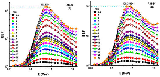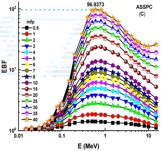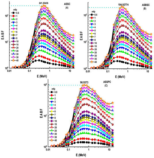 Nevertheless, the greatest Zeq values were observed for all photon energy for the ASSPC sample. The buildup factor is a correction factor for the impact of dispersed radiation that takes into account any secondary particles in the medium. The accumulation variables must be considered to account for the accumulation of secondary ionizing radiation. Thus, the accumulation factor is a multiplier that compensates for the response to non-confronted photons, including the contribution of scattered photons. Therefore, the buildup factor is a multiplier that compensates for the response to non-confronted photons and incorporates the contribution of scattered photons. The term “buildup factor” has two sub-definitions: exposure buildup factor (EBF) and energy absorption buildup factor (EABF). Between 0.5 and 40 mfp, the EBF and EABF values of three different alloys were found using the G-P fitting technique.