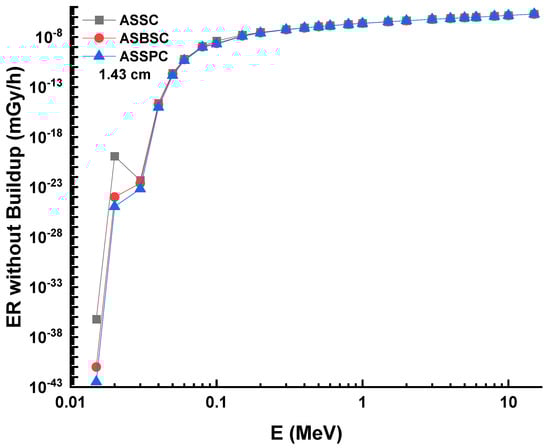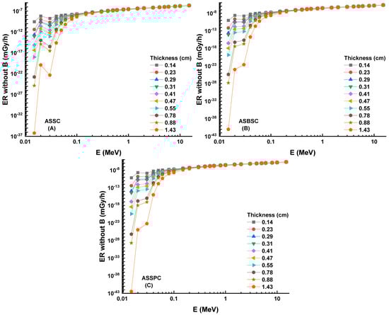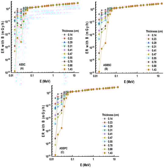 A similar situation was also reported for ERs without buildup factor, as shown in Figure 9A–C. Dependence of the exposure rate without buildup factor on the thickness of three shields. ERs of ASSC, ASBSC, and ASSPC samples without buildup were reported as 0.000002012, 0.000002001, and 0.000001995 for 1.43 cm at 15 MeV photon energy, respectively. A clear demonstration of exposure rate with/without buildup factor versus energy for 1.43 cm thickness can be seen in Figure 10 and Figure 11, respectively. Although the differences were reported with relative differences for ERs with/without buildup factor, the lowest values were recorded for ASSPC sample at all photon energies. Finally, Figure 12 shows the mass removal cross sections (ΣR) of alloy samples that were theoretically determined against fast neutrons. This parameter is a useful indicator for the attenuation properties of shielding materials against fast neutrons. The highest ΣR value was reported for ASSPC even though the numerical differences between the samples were not high. The contribution of Bi in the ASSPC sample is minimum. Therefore, elemental mass fraction, and accordingly, contribution of highest Z element (Bi = 83) is minimum. Therefore, it can be considered as an expected situation between the investigated alloy samples.
