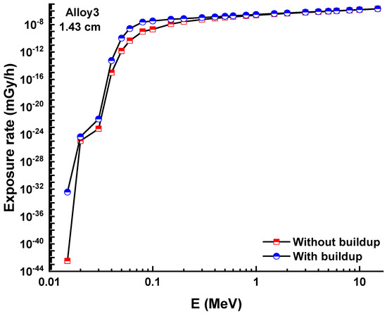 Exposure rate with and without buildup factor versus energy for Alloy3.