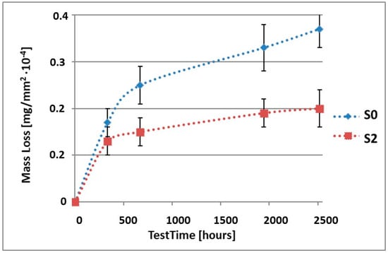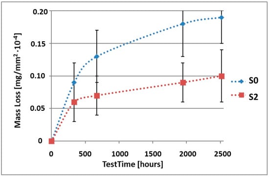 Comparison of the mass losses of samples S0 and S2 for tests in NSS environment.