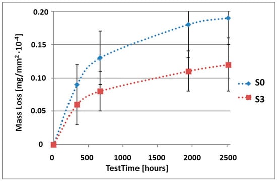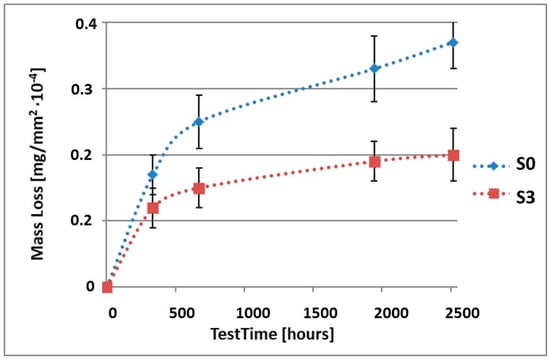 Comparison of the mass losses of samples S0 and S3 for tests in NSS environment.