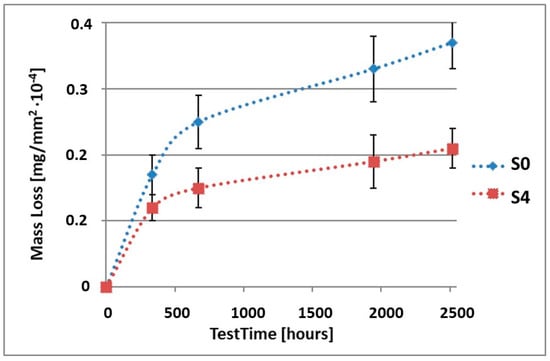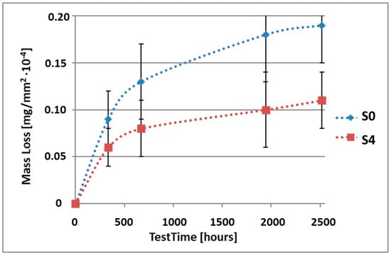 Comparison of the mass losses of samples S0 and S4 for tests in NSS environment.