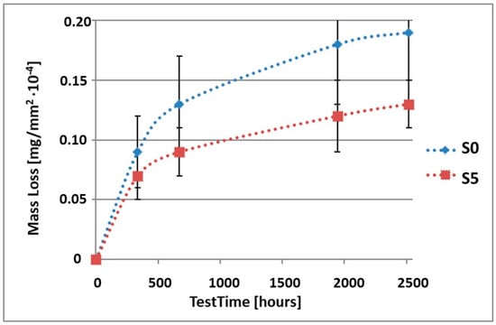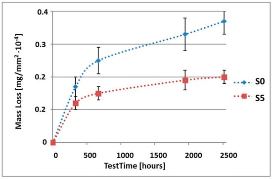 Comparison of the mass losses of samples S0 and S5 for tests in NSS environment.