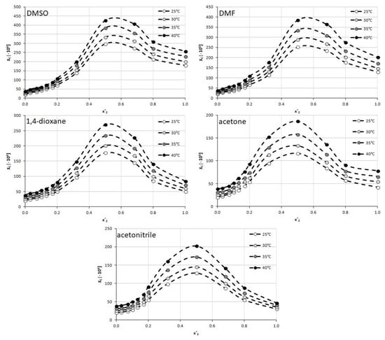 The five mentioned organic solvents were used to create binary solvents with water in different mole proportions. For each solvent–water system, twelve different compositions were studied including both neat solvent and water. The temperature range was set from 25 °C to 40 °C with 5 °C intervals. For all of the studied solvents, the increasing temperature resulted in an increase of caffeine solubility and the general trend of solubility profiles remains the same in all cases. The obtained results are collected in Figure 2 and the corresponding detailed values of caffeine mole fractions can be found in Supplementary Materials, Tables S3–S7.