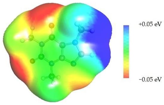 Quite surprising conclusions can be drawn from the results provided in Table 1, namely, caffeine can act as a donor in pairs formation with all considered APAS. The hydrogen atom bound to the carbon atom within the five-membered ring (C8) has quite an acidic character and can be directly involved in non-covalent interactions with solvent molecules. Hence, negative centers located on oxygen atoms of solvent molecules can complete the pair formation with proton-accepting sites. On the contrary, with proton donating molecules, for example, water, caffeine plays the role of an acceptor in pair formation via the basic center of the nitrogen atom (N9) located on the imidazole ring. The same feature might be observed for alcohols and other proton donating molecules. In the case of caffeine contacts with aprotic solvents, molecules of the formed pairs can be considered as examples of weak hydrogen bonds. This can be interfered with by geometric features of the considered pairs. It is evident that hydrogen bonds are much longer in all cases of apolar solvents if compared with the caffeine–water hydrogen-bonded pair. Despite this fact, the stabilization of pairs of DMF and DMSO with caffeine is as high as in the water complex. This is in interesting correspondence with the high solubility of caffeine in these solvents. The interactions of caffeine with the other three apolar solvents are weaker, with the smallest stabilization of pairs formed with acetonitrile, and this order also corresponds to the observed solubility. It is also worth highlighting that the involvement of the C8 atom of caffeine might be anticipated after inspection of the electrostatic potential distribution. This is documented in Figure 3 by plotting the isosurface in the range of <−0.05 eV, +0.05 eV>. It is clearly visible that there is a very large blue region in the vicinity of the hydrogen atom involved in pairs formation with aprotic molecules, indicating an electropositive character of this fragment of caffeine. Hence, this observation might be used in anticipating interactions with apolar solvents with negative centers.