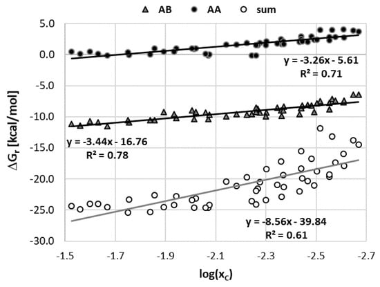 Previously mentioned qualitative agreement between the computed solute–solvent affinities and measured solubility of caffeine is the starting point for further exploration of the usefulness of the computed values of caffeine affinities as a potential prognostics of its solubility. For this purpose, plots were prepared relating the experimental solubility with computed values of Gibbs free energies of self- and hetero-association of solute–solute (AA), solute–solvent (AB) and solvent–solvent (BB) interactions. The former includes only caffeine dimerization. The second type comprises two kinds of contributions coming from interactions with water and the organic solvent. The latter type involves all homo- and hetero-pairs formed between solvent molecules. The obtained results are provided in Figure 4. In particular, AA denotes caffeine dimerization, AB1 caffeine-organic solvent pairs formation, AB2 caffeine-water pairs formation, BB1 organics self-association, BB2 water dimerization and BB12 hetero-association of solvent molecules.
