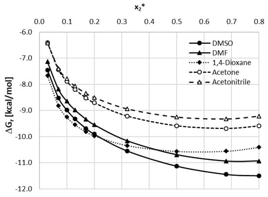 The results provided in Figure 4 reveal a quantitative relationship between caffeine affinities and the measured solubility values. It is worth mentioning that values of ΔGr used for plots preparation correspond to concentration-dependent equilibrium constants (Kx) rather than the activity ones (Ka), which were included in Table 1. By separating mole fraction contributions to equilibrium constants from contributions coming from the activity coefficient it is also possible to inspect how the concentration of the solvent affects the affinity ΔGr(x), as seen in Figure 5. It seems that there is a correlation between experimental solubility and solute–solvent affinities with acceptable linearity (R2 = 0.78) of this relationship. Hence, Figure 4 further documents the importance of direct contacts of caffeine, although the existence of linear relationships is not so obvious taking into account that only pairs are included in the solubility modeling. Caffeine dimerization, although much less favorable under all studied conditions, also exhibits a linear relationship with respect to experimental solubility. However, total intermolecular interaction including all possible contacts is a much less reliable prognostic for solubility predictions. Probably including many potential multi-molecular complexes in the model would be beneficial. Unfortunately, this is prevented not only by the number of potential structures to be considered but also by the expense of computations, which include not only zero-point energy correction but also encompass electron correlation and dispersion corrections.