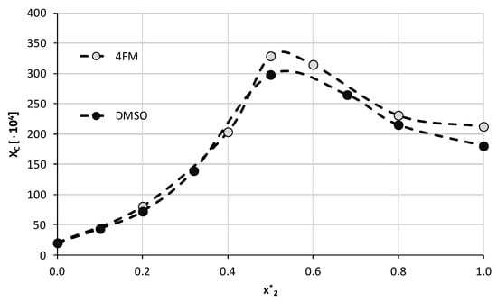The trend of solubility changes observed for DMF is rather similar to that of the former solvent. Again, after an increase in caffeine solubility, an inflection point can be observed at x2* = 0.5 with the highest mole fraction equal xC = (383.96 ± 2.16)∙10−4 at 40 °C, which stands for a 90% increase in solubility compared to neat DMF. In both of the above solvents, the solubility decline after reaching the point of the optimal composition is less pronounced than the initial increase of solubility.