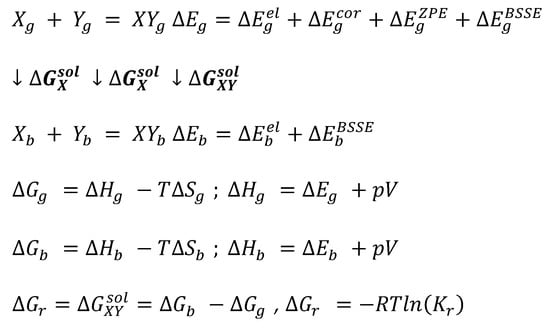 Computations of the equilibrium constant are realized in COSMOtherm via a typical thermodynamic cycle scheme. It involves geometry optimization both in the gas and bulk phases followed by thermal free energy contribution determined via the COSMO-RS approach, as summarized in Scheme 1. The thermodynamic characteristics of the reaction in the gas phase is the first step, which critically determines the accuracy of predicted values of equilibrium constant. It is essential to emphasize that currently COSMOtherm parameterizations are restricted to density functional theory (DFT) models, which determine the accuracy of the reaction energy. In particular, the BP86 functional is used in the majority of physical properties computations. Due to its inherent limitations, it is necessary to go beyond DFT using high-level quantum chemistry computations for enhancing the accuracies of energy determination. Hence, three types of corrections to the values of electronic energy are added for accurate computations of the total gas phase energy, namely (1) accounting for the electron correlation energy,, improperly computed using merely the DFT level, (2) correction for the zero Kelvin vibrational energy,, and (3) basis superposition error. Since the gas phase properties can be significantly affected by the accuracy of computations [86], the electron correlation computed on RI-MP2 level of theory was included using an extended Ahlrichs def2-QZVPP basis set [87] utilizing the geometry determined in the previous step, namely RI-DFT BP86/def-TZVP. Besides, the values of the zero-point vibrational energy (ZPE) were computed at RI-DFT BP86 (B88-VWN-P86)/def2-TZVPD level. The BSSE can be estimated using a DFT-C approach, which formulation includes atom–atom many-body corrections and is a parameterized geometry-based method [88]. These computations are to be performed for every conformer for all reagents and averaged with weights corresponding to population percentage estimated using Boltzmann probability. The final values of the reaction Gibbs free energy, ΔGr, account for all thermal free energy of the gas phase contribution and the Gibbs free energy of solvation quantifying the contribution of transfer from gas to liquid.