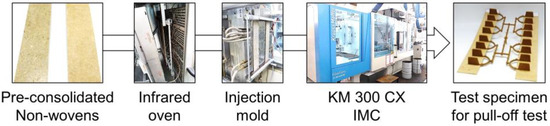 Spruce logs from the Rosenheim area were manually debarked and reduced to chips using a Bruks drum chipper (type CV 400N-2M, Siwertell AB, Bjuv, Sweden). The defibering of the fresh wood chips was carried out on a 12″ laboratory refiner (type 12 1CP, Andritz AG, Graz, Austria). Thermo-mechanical pulping took place at 160 °C and 5.2 bar saturated steam pressure for 3 min. The 12XASR01 grinding disc was used for defibering. For direct compounding, the moist spruce fibers were further processed into pellets by a pelleting press (type RMP 250, MÜNCH-Edelstahl GmbH, Hilden, Germany). During pelleting, the feed rate of the metering screw and the compression are controlled manually. The wood fiber pellets were compounded with polypropylene and the coupling agent at a temperature of 170 °C on a Krauss Maffei injection-molding-compounder (type KM 300 CX IMC, KraussMaffei Group GmbH, München, Germany). Before processing the WPC, the wood fiber pellets and the coupling agent were dried at 80 °C for 3 h in a circulating air oven. After drying, the moisture content of the materials was below 0.5 wt.-%. The processing of polypropylene with wood fibers by direct compounding has been published elsewhere [12]. For the non-woven production, the wood fibers were laid with PP fibers to form a non-woven via an air-lay system. Details of this process have already been presented [61]. The non-wovens were pre-consolidated via a heated (200 °C, isobaric, type LA 100, Robert Bürkle GmbH, Freudenstadt, Germany) and a cooled press (40 °C, isochoric, type LP 370, Dieffenbacher GmbH, Eppingen, Germany) to a thickness of 2 mm (see Figure 2). Before being placed in the injection mold, the inserts were heated to a core temperature of 170 °C using an infrared oven. The infrared oven was built by the TH Rosenheim with infrared heaters from KRELUS (heater type G14 -25 -2,5 MINI 7,5, Krelus AG, Sarnen, Switzerland).