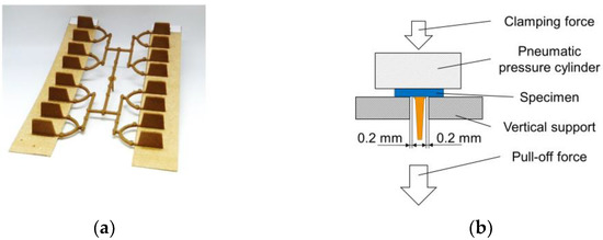 The bond strength of the molded ribs on the non-wovens (see Figure 4a) was determined via a pull-off device. Figure 4b shows a schematic picture of the pull-off device. A Zwick/Roell type Z020 universal testing machine was used (ZwickRoell GmbH & Co. KG, Ulm, Germany). The pull-off speed was 10 mm/min.