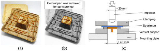 Compared to test series 1, in test series 2 the unconsolidated non-wovens were heated to a core temperature of 170 °C and pressed in an isochoric process to a thickness of 2 mm via a heated press and inserted into the injection mold directly. The WPC was processed on a standard injection molding machine with a three-zone screw at 170 °C. For material testing, the central part was removed from the specimens (see Figure 5b) and tested using a puncture test according to ISO 6603-2/40/20/C/4.4 (see Figure 5c). An Amsler HIT1100F drop impact tester from ZwickRoell GmbH & Co. KG (Ulm, Germany) was used for this purpose.