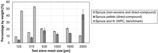 The gravimetric size distribution was measured using an air jet sieve (see Figure 6). Optical measurement methods cannot be used to compare fibers and fiber pellets, as their geometries differ too greatly. However, the low standard deviation in the analysis of spruce fibers indicates a high reproducibility. The standard deviation for the pellets is significantly higher. This is because smaller pieces detach from the pellets during screening. The spruce fibers in Figure 6 were used on the one hand for the wood fiber non-wovens, and on the other hand as pellets for direct compounding. The spruce and fir used in the WPC benchmark is very small in comparison and can be described as wood flour. The length of the natural fibers kenaf and hemp from the benchmark material is in the range of 5 to 10 cm. Consequently, no air jet sieve analysis is possible for the natural fibers.
