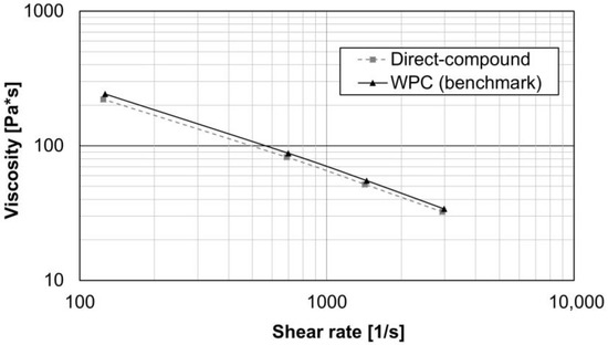 The following diagram shows the melt viscosity measurement of the two injection materials used. The MFR value of the direct-compound is (12 ± 1) g/10 min and of the WPC is (20 ± 1) g/10 min (see Table 1). The viscosity measurement with a high-pressure capillary rheometer shows that the viscosities are almost identical over a higher shear rate range (see Figure 7). The effect of the injection material on the bond strength is shown and discussed in Section 3.4. Test series 2 was carried out in the technical center of FRIMO Sontra GmbH on a standard injection molding machine. Consequently, only the WPC was used in test series 2 (see Section 3.6).