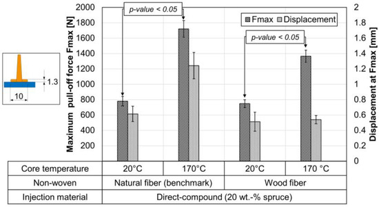 Pull-off test of ribs with foot at two different non-woven core temperatures; injection material direct-compound with 20 wt.-% spruce; n = 7 ± SD; p-value with single-factor ANOVA at α = 0.05.