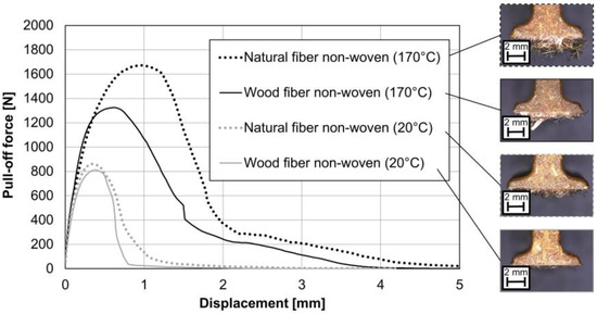In the case of unheated semi-finished products, adhesive fracture failure occurs at the rib-to-non-woven interface. On the microscopic images in Figure 9, almost no fibers can be seen on the ribs after the pull-off at unheated non-wovens. In heated non-wovens, cohesive failure occurs within the non-woven, which significantly increases the maximum pull-off force. After the pull-off of the heated non-wovens in both cases, many fibers can be seen on the ribs (see Figure 9). In the case of semi-finished products with natural fibers, heating also results in a change of displacement (see Figure 8 and Figure 9). The fracture behavior in the heated state is determined by the semi-finished products and not by the interface. The much shorter wood fibers do not seem to affect this.