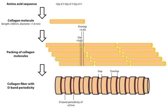 The structure of a collagen fiber type I, from the amino acid sequence to the D-band periodicity. As presented at the top of the figure, the collagen molecules consist of three amino acid chains. The length of the collagen molecule is 300 nm, while its diameter is 1.6 nm. The amino acid chains form rod-shaped triple helices which are assembled to form collagen molecules. Molecules are packed in a quarter-staggered fashion in order to form fibrils with a pattern that is known as the D-band periodicity. This pattern consists of overlapping and gap regions; it is a repeating banding pattern of about 67 nm as shown at the bottom of the figure.
