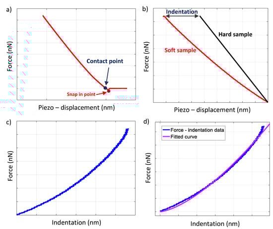 The procedure is briefly presented in Figure 3. Firstly, a force vs. piezo-displacement curve on the sample of interest is acquired, and the contact point between the AFM tip and the sample is determined. In the case of force curves in hard samples, the contact point is usually easily determined as presented in Figure 3a. It should be noted that useful software platforms are available for the contact point determination (and for processing the raw force–indentation data), such as the AtomicJ software [45]. At this point, it is significant to distinguish the contact point from the snap-in point in Figure 3a. During sample’s approach towards the AFM tip, the long-range attractive force causes the tip to snap in toward the sample surface (Figure 3a). The snap in point represents the initial point of contact (assuming that the tip lies perfectly on the surface after snapping in without any deformation of the sample surface) [20]. However, in most of the cases of AFM indentation experiments on collagen, the contact point is considered as the point where the adhesion balances the repulsive force (zero cantilever deflection). The reason is that, after the aforementioned point, the indentation of the tip into the sample begins.