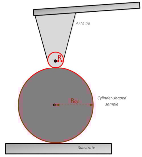The equations presented in Section 2.2 presuppose that the sample can be considered as an elastic half space [16,54,55]. In other words, the sample is significantly bigger than the AFM tip and presents a linear elastic behavior. Thus, they can be used only if the radius of the collagen fibril is extremely big compared to the tip radius [56,57]. A rational approximation to apply the equations of Section 2.2 is the fibril radius to be at least 5 times bigger compared to the tip radius [56,57]. However, from a rigorous mathematical perspective, when indenting a collagen fibril using an AFM tip the interaction can be modelled as the interaction between a rigid sphere, and a cylinder-shaped sample under the restriction that the tip apex can be considered as spherical (Figure 4). As previously reported [58], the projected area at contact depth is elliptic and the Young’s modulus can be calculated using the following equation: