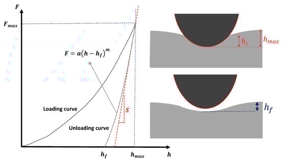 In Equation (20), hc represents the contact depth (i.e., the depth at which contact is made between the indenter and the sample). The contact depth can be determined as follows [20,51]:
