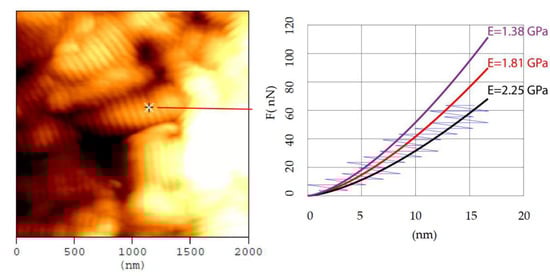 In Figure 7, three different fitted curves are shown for the loading force–indentation data obtained at the point indicated in the topography image. Assuming that only the first 5 nm are taken into account (purple curve), the calculated Young’s modulus resulted in . Assuming the first 9 nm, the appropriate fitting is the red curve, thus the Young’s modulus results in . For indentation depths comparable to the tip radius, the most appropriate fitting curve is the black one; in this case, the calculated Youngs modulus results in . The aforementioned calculations were performed assuming Poisson’s ratio [24] and purely elastic contact between a sphere and a half space (the radius of the fibril was which is 10 times bigger than the tip radius, thus the elastic half space approximation is rational) [20,56,57]. In other words, Equation (4) was used. It is interesting that the third calculation (i.e., ) is bigger compared to the first one (). Thus, it is obvious that there are significant uncertainties when fitting the force–indentation data that can justify up to a point the significant range of values when using the same experimental protocols (even when testing the same fibril). An interesting analysis which shows the extended number of different curves that can be used to describe the same collagen fibril is also shown in [22]. From the aforementioned analysis, it is clearly shown that the Young’s modulus on a specific point will differ based on the maximum indentation depth that will be used for data processing [22].