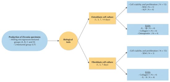 Once the surfaces were textured, all samples were sintered in an oven (Zirkonofen 700, South Tyrol, Italy) and then cleaned with isopropyl alcohol using ultrasonic equipment. The samples were then sandblasted for 30 s with particles of alumina (Al2O3) with an average size of 250 μm, 6 bars of pressure and 12 cm of distance, and washed again with ultrasonic equipment and isopropyl alcohol. After this step, each sample was immersed in hydrofluoric acid (48% HF) at room temperature for half an hour and cleaned once more with ultrasonic equipment, where it was immersed in isopropyl alcohol for 5 min, resulting in a surface roughness of 1.45 μm. In the final step, an ultrasonic bath process was once again performed for all the samples with absolute ethanol and sterilized in the autoclave in order to carry out all biological tests (Figure 1). All the biological tests were repeated in three independents experiments.