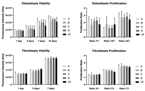 Fibroblast and osteoblast viability and proliferation measured as means and presented as bar graphs, with error bars representing the standard deviation. They were obtained in fluorescence intensity (AUs) and proliferation ratios after up to 14 days of culturing (N = 15). The group comparisons were based on one-way ANOVA with post-hoc Tukey.