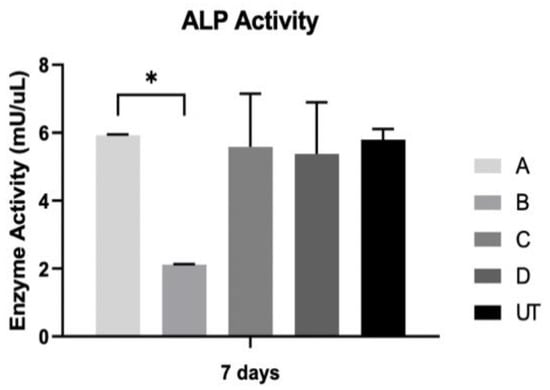 ALP results based on the suspension of osteoblasts are shown in Figure 5. The results show the greatest ALP activity from the A group, but only with significant differences when compared to the B group (p < 0.05). When compared to all the study groups in regard to alkaline phosphatase activity, there were no statistically significant differences between all groups (p > 0.05).