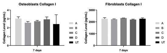 Concentration of collagen I (pg/mL) was assessed on fibroblast and osteoblast cultures at 7 days (N = 4), measured as means presented in the form of bar graphs, with error bars representing the standard deviation. The group comparisons were based on Kruskall–Wallis with Dunn’s post-hoc tests.