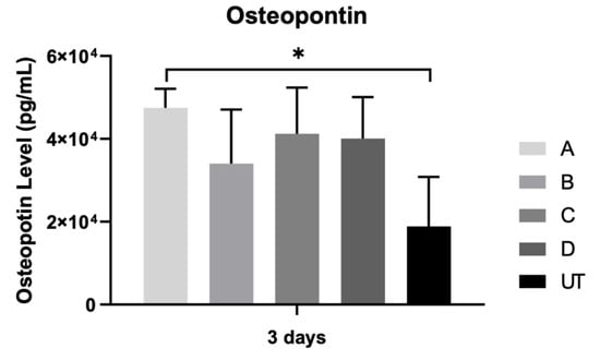 The osteopontin concentration was assessed after 3 days of the osteoblast culturing (Figure 8). There was a marked increase in osteopontin production for all the samples, without statistically significant differences when all groups are compared (p > 0.05).