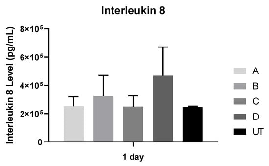 Mean concentration of Interleukin 8 (pg/mL) was assessed on fibroblast and at 1 day (N = 4), measured as means presented in the form of bar graphs, with error bars representing the standard deviation. The groups comparisons were based on Kruskall–Wallis with Dunn’s post-hoc tests.