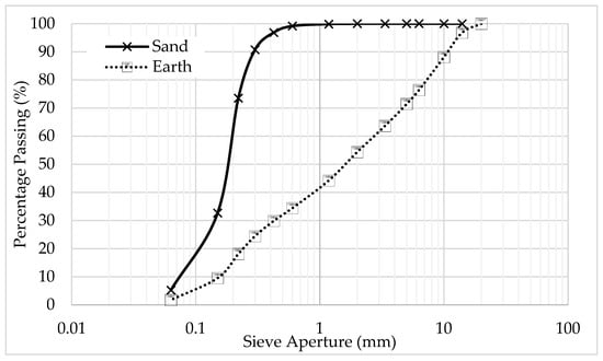 The sand and earth grain size distribution is presented in Figure 1. They were characterised in accordance with EN 1015-1. The dry bulk density of sand is 2500 kg/m3 and of earth is 2527 kg/m3.
