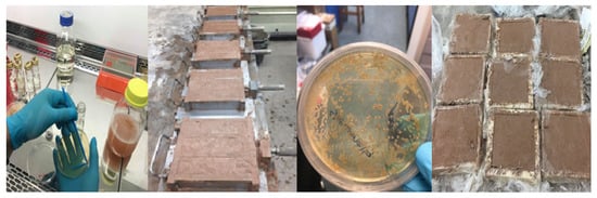 Cultures of S. oneidensis were incubated at 30 °C to achieve the concentration of 2.3 × 108 cfu/mL. The bioproduct was then used to prepare earth-based and cement-based mortars with a ratio of 6% of binder. Figure 2 presents the bioproduct and mortar samples.