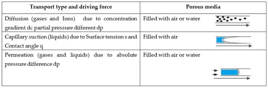The porous medium of each mortar, which includes cracks and voids within earth- and cement-based materials, enables the transport of carbon dioxide and oxygen and water and ions, with a direct impact on the durability of the structures. The transport is caused by a change in the concentration of the ions, pressure gradients for gases and water, differences in the absolute pressure for gases and water, migration, and capillary forces. Figure 3 presents the different types of transport processes in an earth- or cement-based medium.