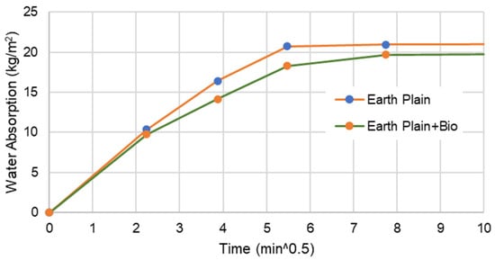 In the asymptotic value stage—when the samples tend to become saturated—the biostabiliser shows a constant contribution of a 5% decrease in water absorption for the earth-based mortars. For the cement+bio mortars, the contribution to decrease absorption was above 15%.