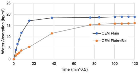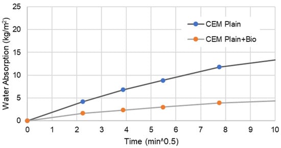 It is observed that the initial water absorption tends to be lower for the bio samples than the non-bio samples, which is a desirable result. At this range, the water absorption via the capillary tends to reduce by at least 60% if the mineral precipitation is promoted in cement-based mortars. For earth mortars, the contribution of this mineral precipitation is between a 5 and 10% reduction in the initial stage of water absorption. This emphasises that the biostabiliser can prevent water migration more effectively for cement-based than for earth-based mortars in the initial stage of the capillary absorption.