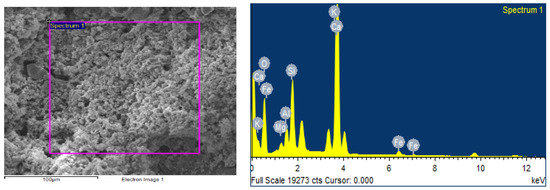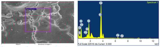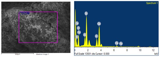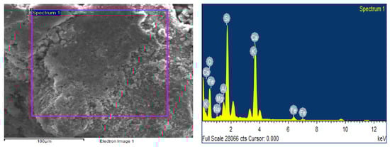 Each mortar sample was crushed, and the inner part was coated in gold in order to investigate the bonding characteristics between the cement paste and the aggregates with or without the biostabiliser. In order to confirm the formation of calcium carbonate precipitation, an EDS analysis was performed for the cement-based (Figure 9 and Figure 10 and Table 3) and earth-based (Figure 11 and Figure 12 and Table 4) mortars.