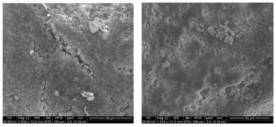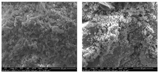 A scanning electronic micrograph of cement and earth mortars with and without biostabiliser was completed after crushing for compressive strength at 28 days of age. The microstructure analysis of the samples is illustrated in Figure 13 (cement-based) and Figure 14 (earth-based). Figure 13 (left) demonstrates the SEM analysis of the cement plain sample with visible micro-cracks and voids. Figure 13 (right) shows the micro-structure of the cem+bio mortar, revealing the existence of crystalline calcium carbonate, which correlates with bacteria precipitation; nearly all the micro-cracks and voids are filled with calcium carbonate. Calcium carbonate in the form of calcite is detected not only in earth-based but also earth+bio mortars (Figure 14 (left and right) and Table 4). This increased quantity of calcium carbonate in the cement- and earth-based mortars with biostabiliser, as observed in the SEM of the cement and earth mortars and EDS, is the microstructure behaviour explanation of the macro behaviour detected for the mortars regarding the compressive and flexural tensile strength increase, as discussed below.