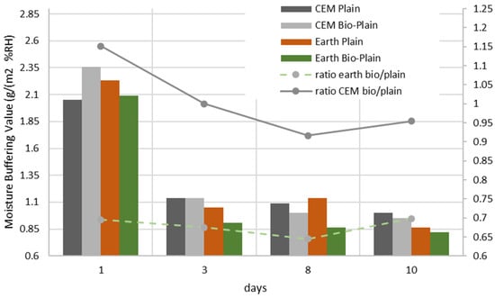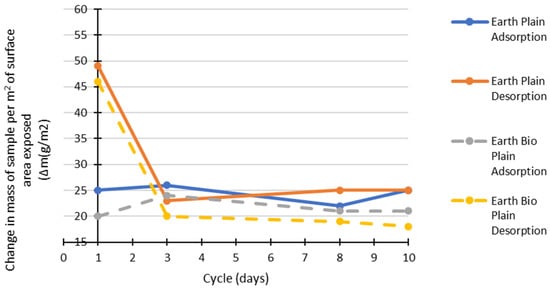 It is generally a desirable property for a material to have a high MBV [35,36]. Figure 15 shows that, for the earth mortars, the biostabiliser tends to lower the MBV in comparison to without the biostabiliser. At the 10th cycle, the results are similar in both situations. Probably, the precipitation decreases the ability of the earth-based mortar to absorb and desorb water vapour from the air, making the material more stable to relative humidity changes. The MBV for the cement mortars with the biostabiliser is at least 15% higher in the first day of cycles, but it tends to decrease with time, and, after three cycles, the MBVs are similar. For the earth mortars, the same biostabiliser can decrease the MBV by between 6 and 13%.