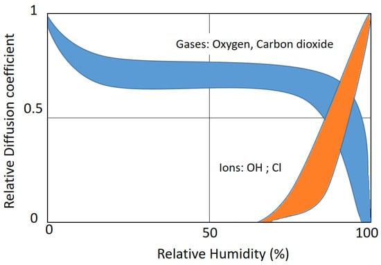 Schematic representation of the diffusion coefficients of ions and gases within a mortar as a function of the relative humidity based on Ref. [38].