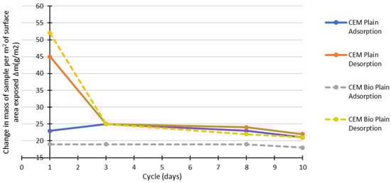Adding the bioproduct leads to a decrease of water adsorption by 18% in the first 3 days of testing in comparison to the cement plain compositions (Figure 17). However, there is 15% more desorption in the first cycle for cem+bio in comparison to plain. After three cycles, there is more desorption than adsorption of water for cem+bio, but the plain compositions present similar absorption/desorption values. The results show that the biostabiliser effect through precipitation seems to decrease the ability of a cement-based mortar to adsorb more moisture from the air. Because the conditions favour desorption in cem+bio, the biostabiliser precipitation seems to facilitate the release of the chemicals into the mobile phase.