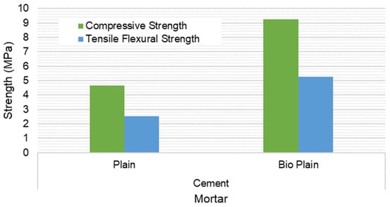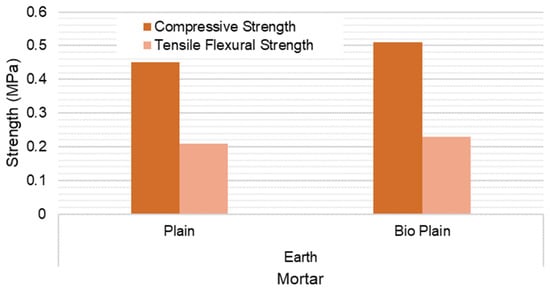 The compressive and three-point flexural test results are presented in Figure 19 and Figure 20. The results show that there is a compressive and flexural strength increase for both compositions if the biostabiliser is used. However, the increase is significant mainly for the cement-based mortars. For the tested earth-based mortars, this increase is around 10% if the biostabiliser is added. This is in agreement with the SEM/EDS results obtained and discussed above. For the cement-based mortars (Figure 20), the strength increase with the biostabiliser is almost double that of the plain one, either for compressive or flexural strength.