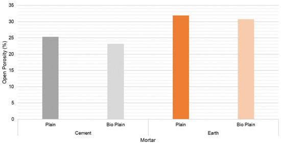 EN 1936:2006 was used to measure the open porosity of the mortars in order to quantify the void space inside the samples and understand the microstructure (Figure 21). Despite earth-based mortars presenting an open porosity of 30%, which is higher than the 25% for cement-based mortars, adding the biostabiliser only slighter decreases this value. However, the porosity results are in agreement with those of other studies focused on earth and cement [21,48].