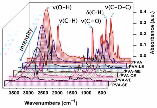 As respects the PVA film loaded with Verbena officinalis extract (PVA-VE), the band of ν(O-H) stretch vibration attributed to phenols compounds such as phenols acids (protocatechuic, chlorogenic and vanillic) or verbascoside shifted to 3319 cm−1 []. Peaks of different heights are situated at 2920 cm−1 and 2851 cm−1, respectively. Their presence was connected with the asymmetric and symmetric stretching vibrations of ν(C–H) of alkanes. The analysis highlighted the common wavenumber for carbonyl structure ν(C=O) bonds at 1732 cm−1 from the flavonoid structure such as luteolin, while the stretching vibration ν(C=C) was found at 1631 cm−1, respectively, and the stretching vibration ν(C-O) bond shifted to 1086 cm−1 from the iridoids structure []. Additionally, the bending vibration of δ(C-H) was situated to lower wavenumbers at 948 cm−1 [].