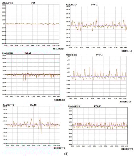 (A) Surface morphology analysis with Raman confocal microscope images PVA (a); PVA-VE (b); PVA-ME (c); PVA-LE (d); PVA-CE (e); PVA-SE (f) and (B) Profiler roughness measurements.