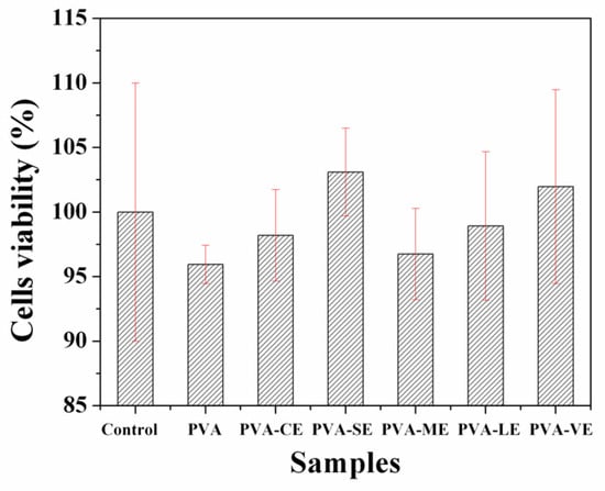 The used cells in the biocompatibility analysis were the rabbit primary fibroblasts, stored at −86 °C. These cells were thawed by immersing the flask in a bath with heated water at 37 °C under gentle stirring in order to accelerate the process of the ice melting and uniformity of the suspension. After the complete melting of the ice, Dulbecco's Modified Eagle Medium (DMEM) culture medium with 10% fetal calf serum and 1% mixture of penicillin–streptomycin–neomycin antibiotics (all for in vitro use) was added to the thawed cells. Then, 24-well culture plates were seeded with a number of 10,000 cells/well, over which a fragment of our studied samples was added in inserts with porous membranes (0.4 µm) using the indirect contact system. Before viability assay, the PVA film and PVA film were loaded with a plant extracts disc of 6 mm in a hood with vertical sterile air flow and immersed in DMEM culture medium with 10% fetal calf serum and 1% mixture of penicillin–streptomycin–neomycin antibiotics.