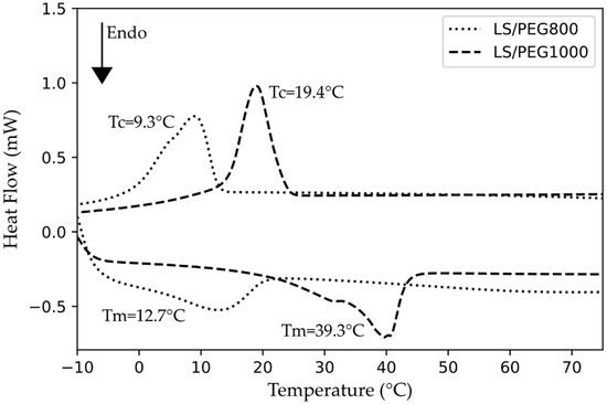 DSC curves of LS/PEG800 and LS/PEG1000 PCM composites, with the indication of the peak temperatures. Data from [25,27].